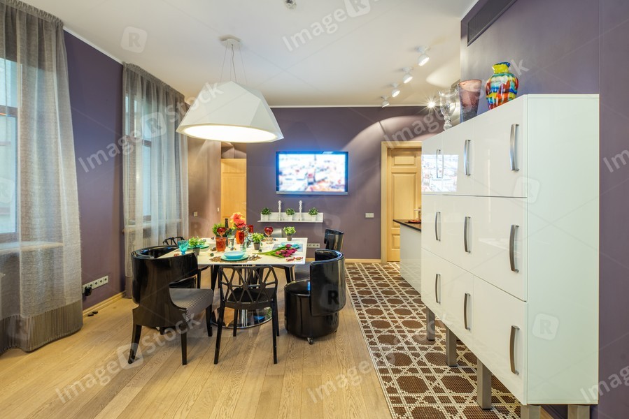 Living room. Windows with curtains. Set table. White cabinets.