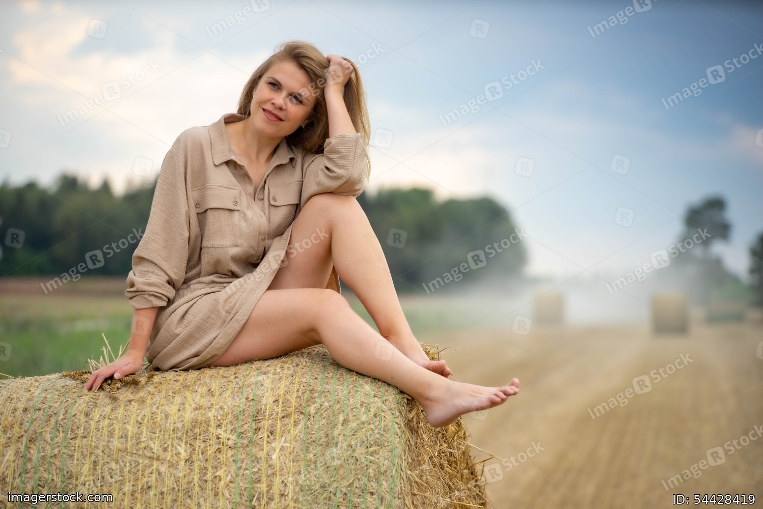 Beautiful happy woman seating on a haystack.