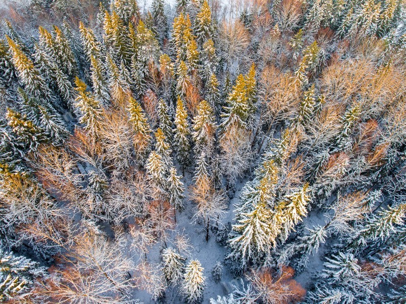 Aerial view of a winter forest in the snow.