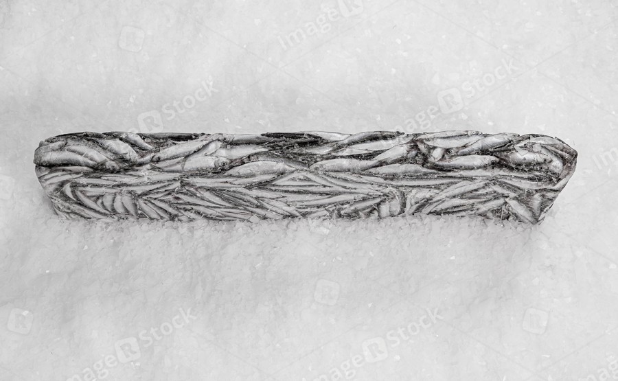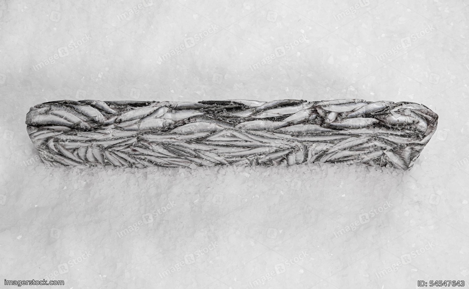 Close-up of sprat brick on the ice in fish market. Winter fishing. Frozen small silver fish. Top side view.