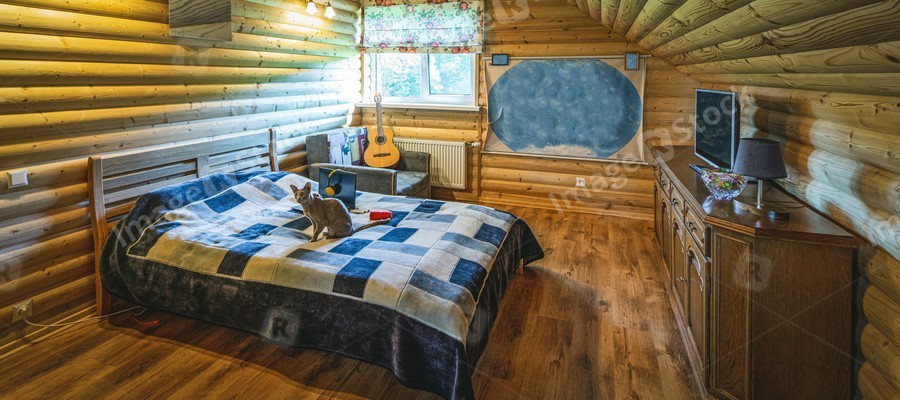 Wooden interior of attic bedroom with furniture. Private country house. Teenager room.