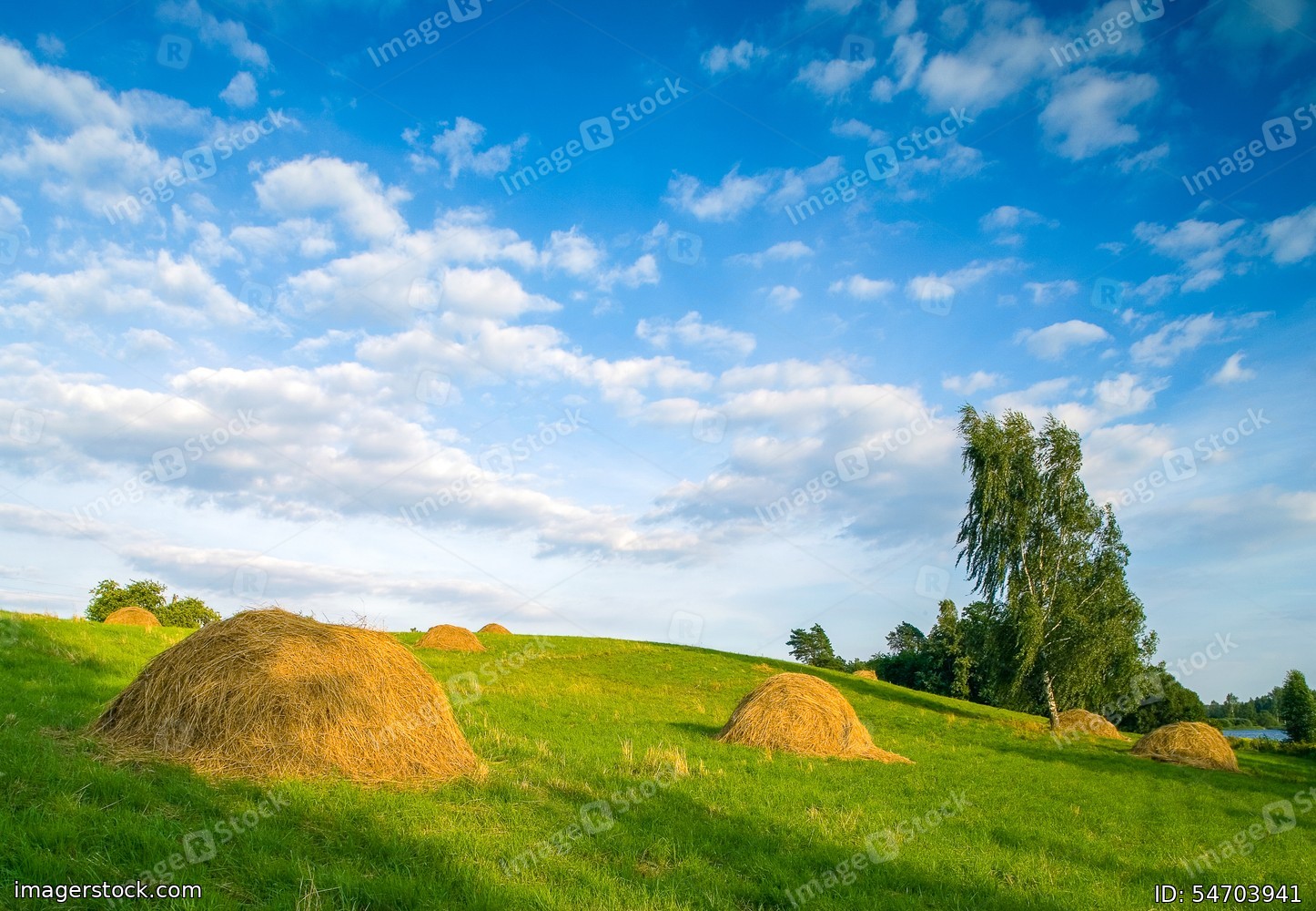 Rick in the field. Harvest. Blue sky, Green field.