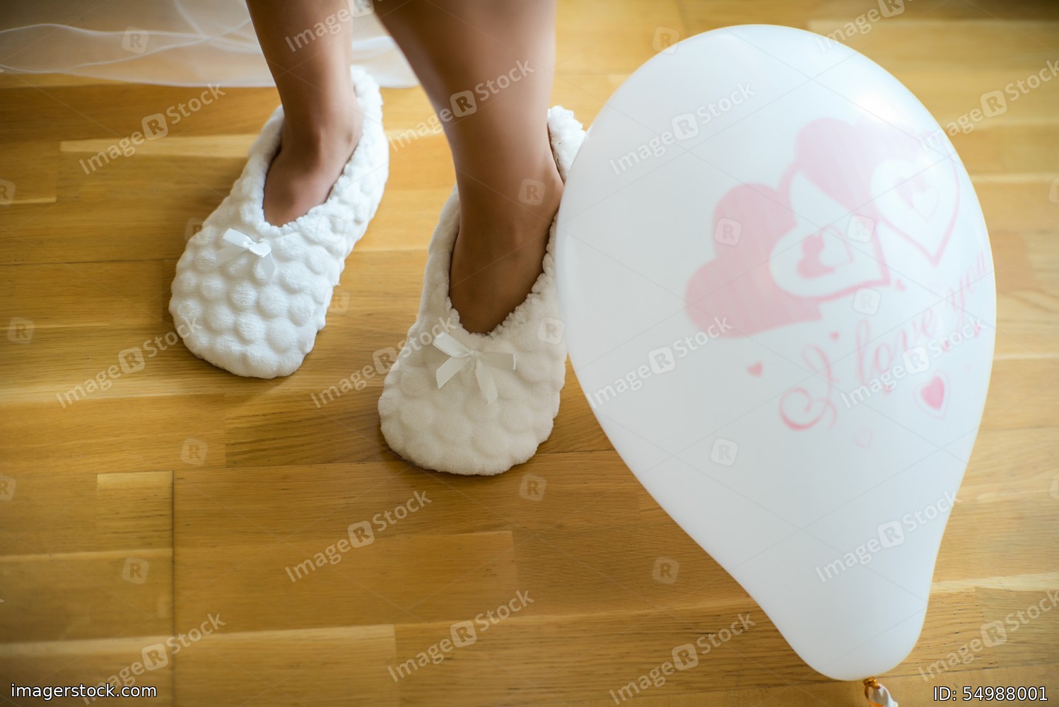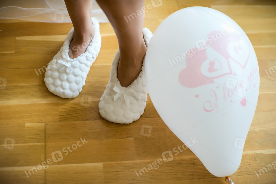 Women's feet in soft slippers and a balloon with the romantic inscription.