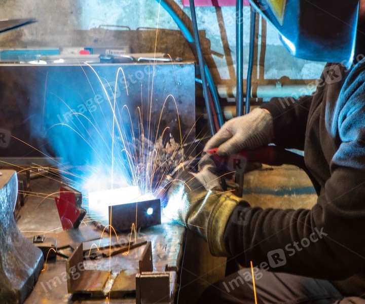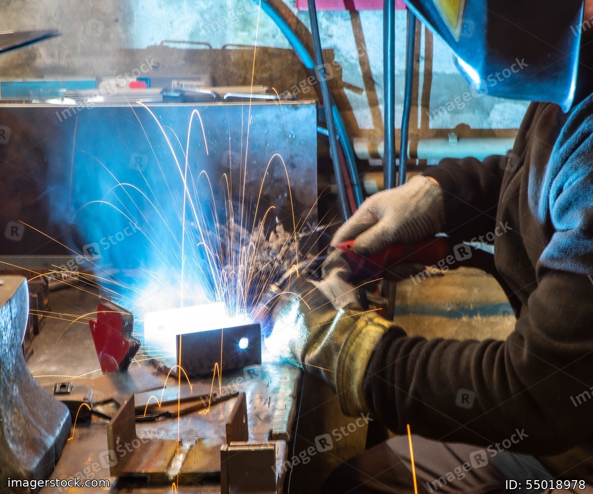Worker in welding mask at factory. Welding process. Electric welding. Bright yellow sparks.