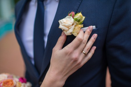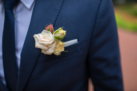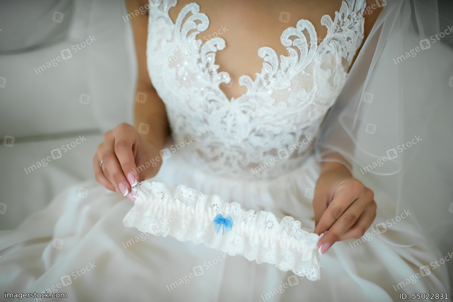 The bride in a white dress trimmed with lace. Garter for the bride.