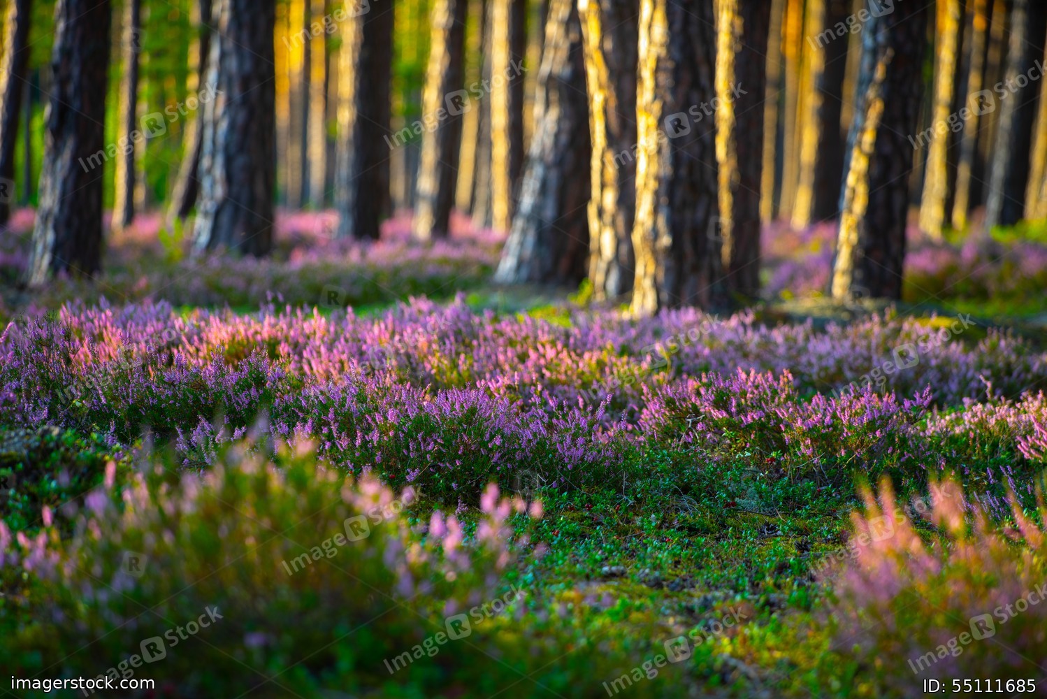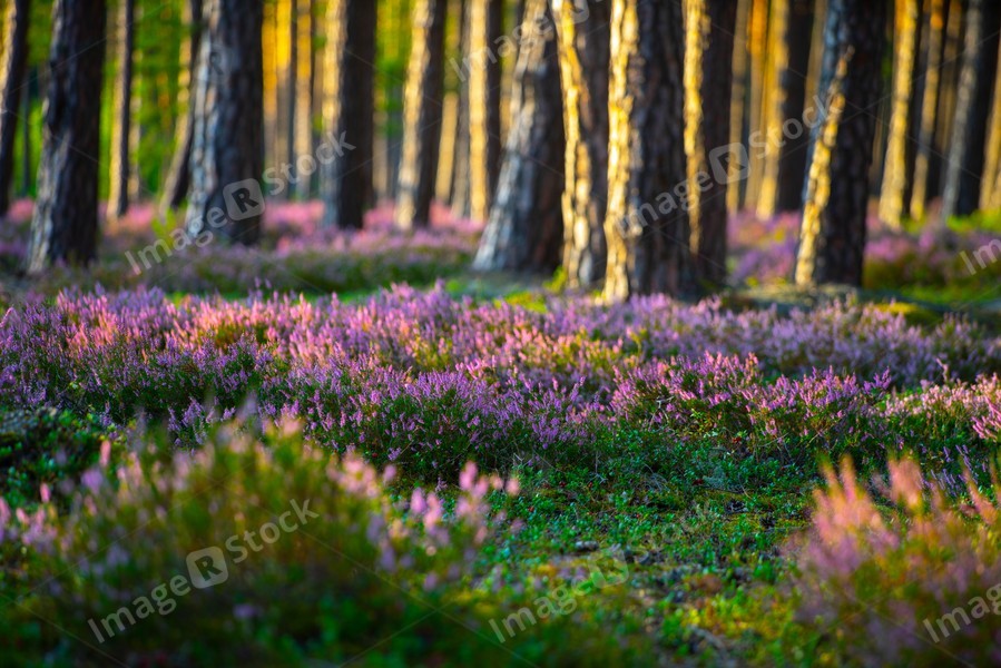 Sunny day. Blooming heather. Beautiful forest.