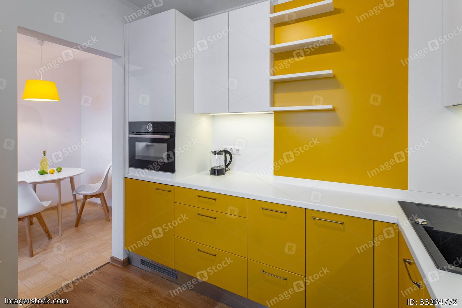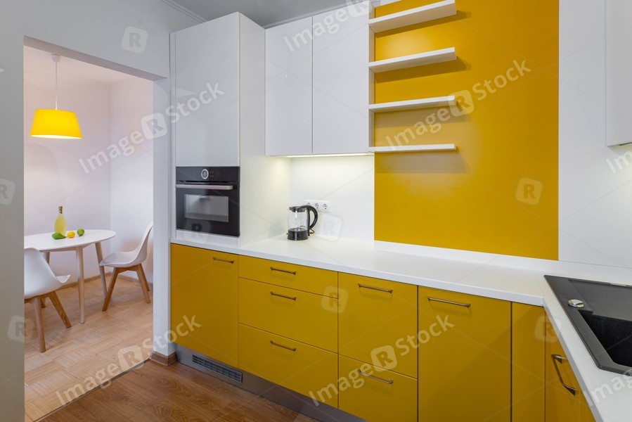 Contemporary interior of kitchen in modern flat. Yellow cabinets and drawers. White counter and shelves. Table and chairs.