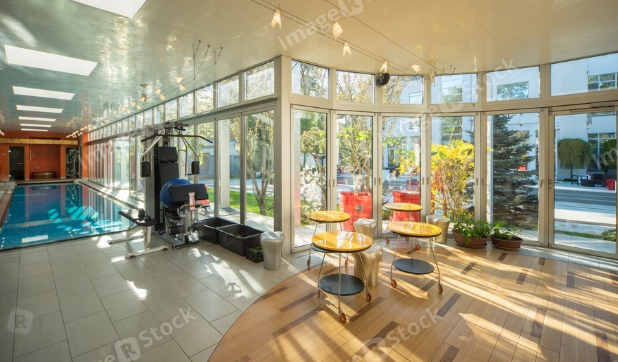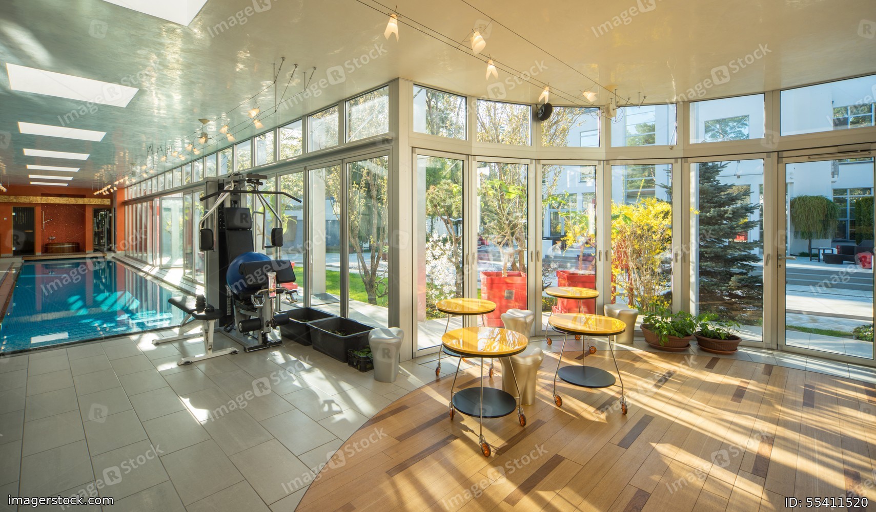 Modern interior of luxury house. Swimming pool. Exercise equipment.
