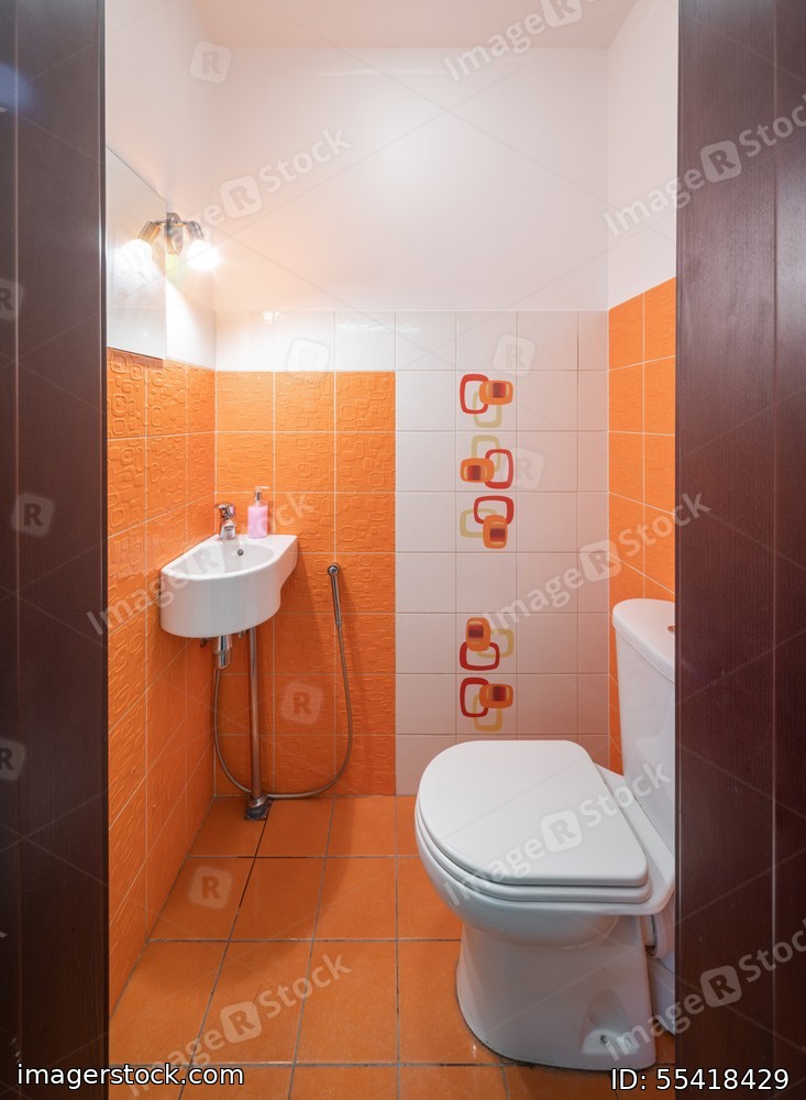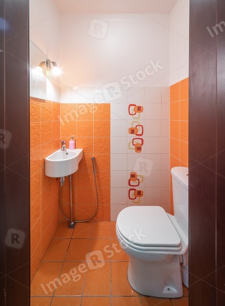 Modern interior of bathroom. Orange tile. Sink and toilet.