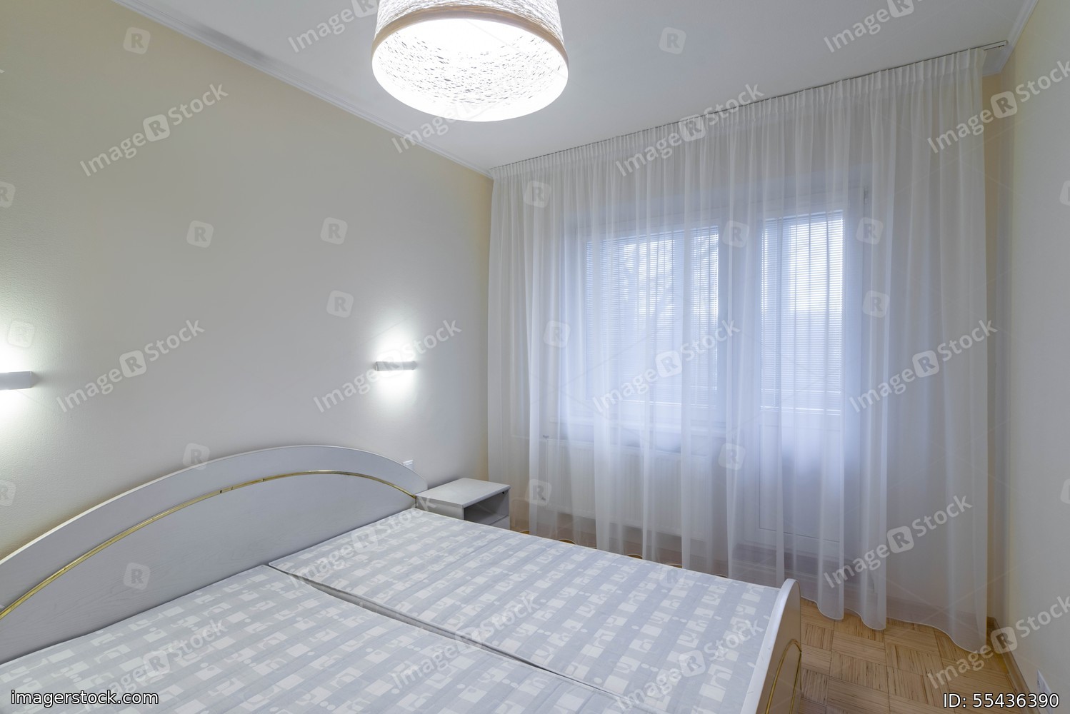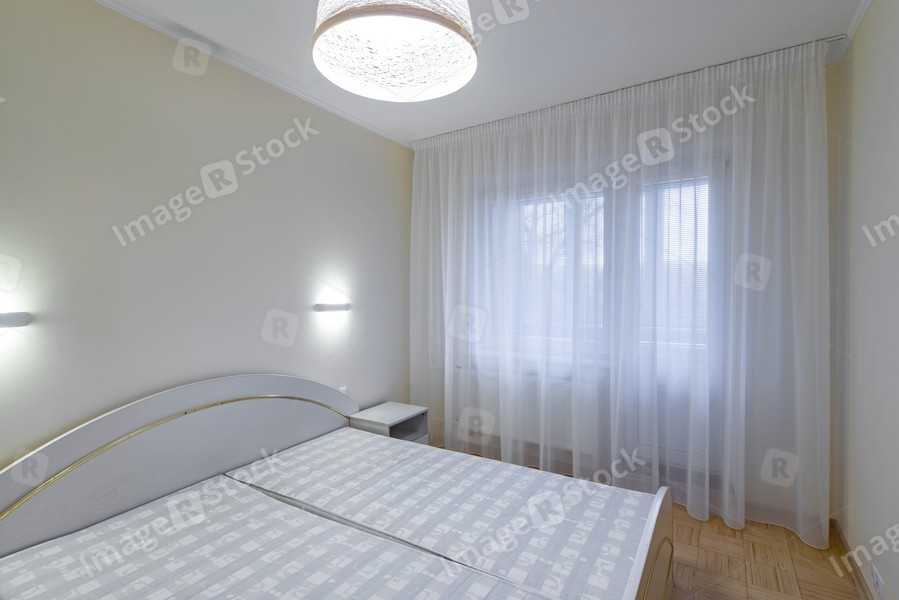 Modern interior of bedroom in light tones. Contemporary apartment. Cozy bed. White walls. Window with tulle.