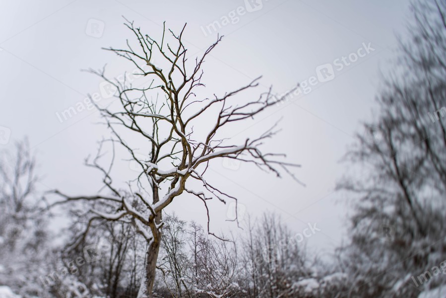 Scenic winter landscape. Beautiful nature. Snow-covered tree in the forest. Cloudy weather.