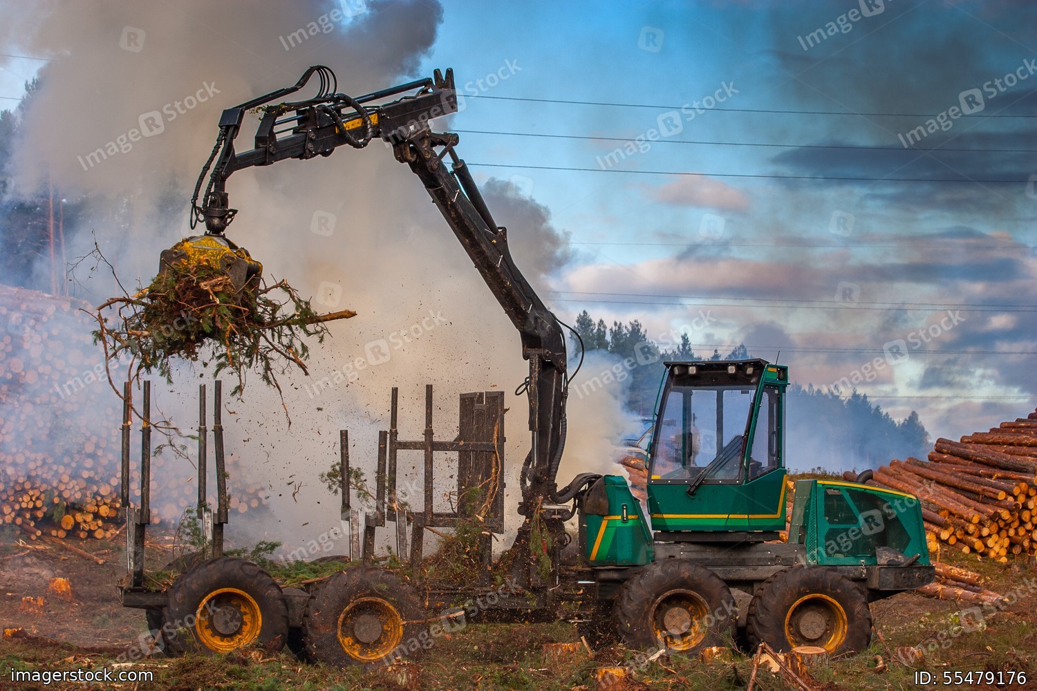 Forest cutting, burning of forest waste. Smoke and fire, tractor.