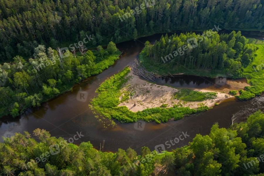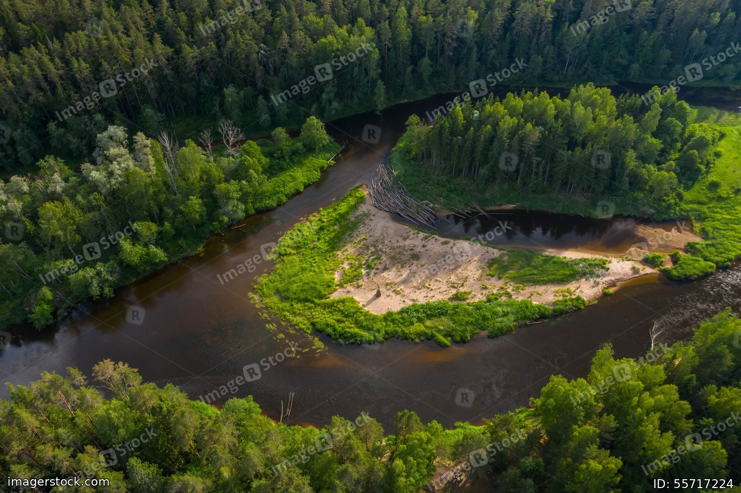 Top drone landscape of summer forest and the river. Green trees. Beautiful latvian nature.