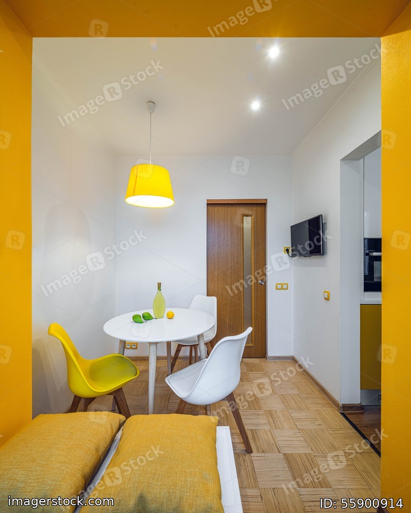 Contemporary interior of kitchen in apartment. Liquor, lemon and pears on table. TV on wall. Wooden door. Yellow and white.