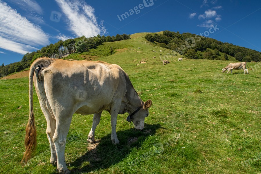 The pasture in the mountains. Cows grazing on the hills. Italy.