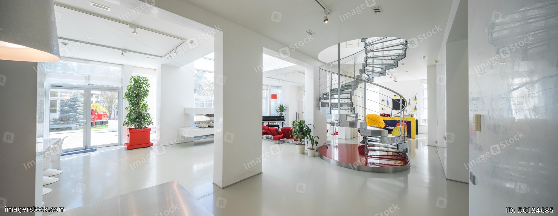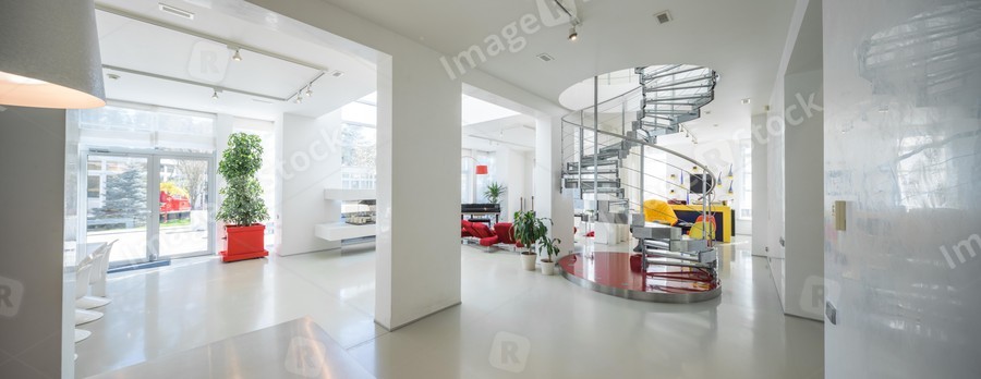 Modern white interior of luxury private house. Spacious living room.
