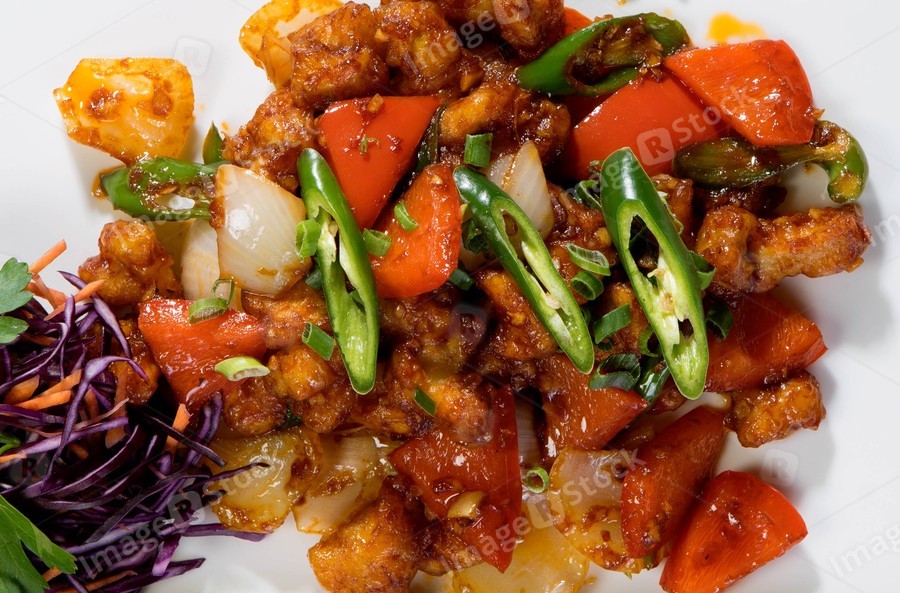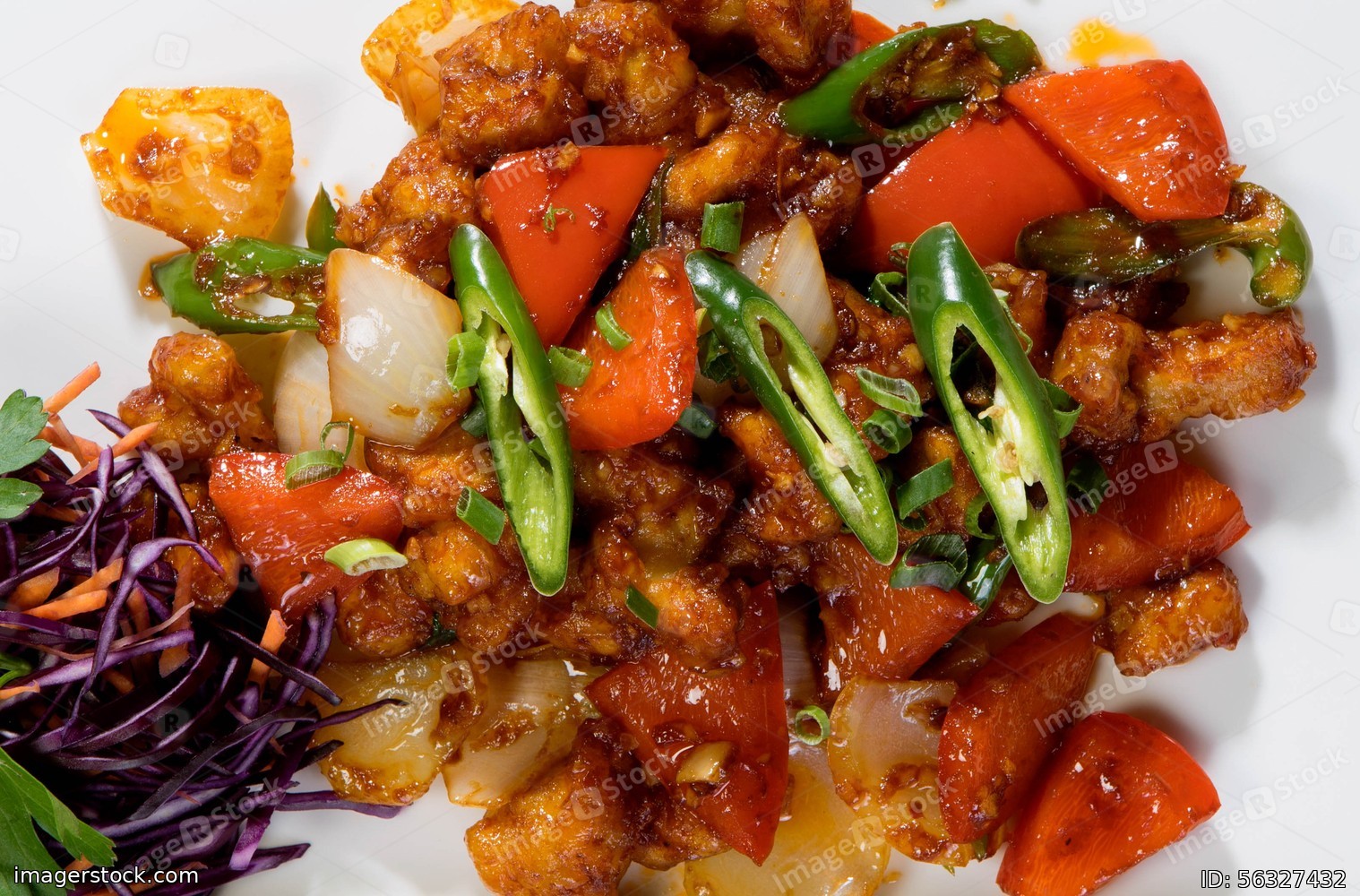 Close-up of fried pieces of meat with vegetables. Tasty food. Asian cuisine.