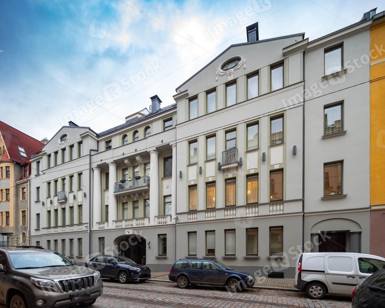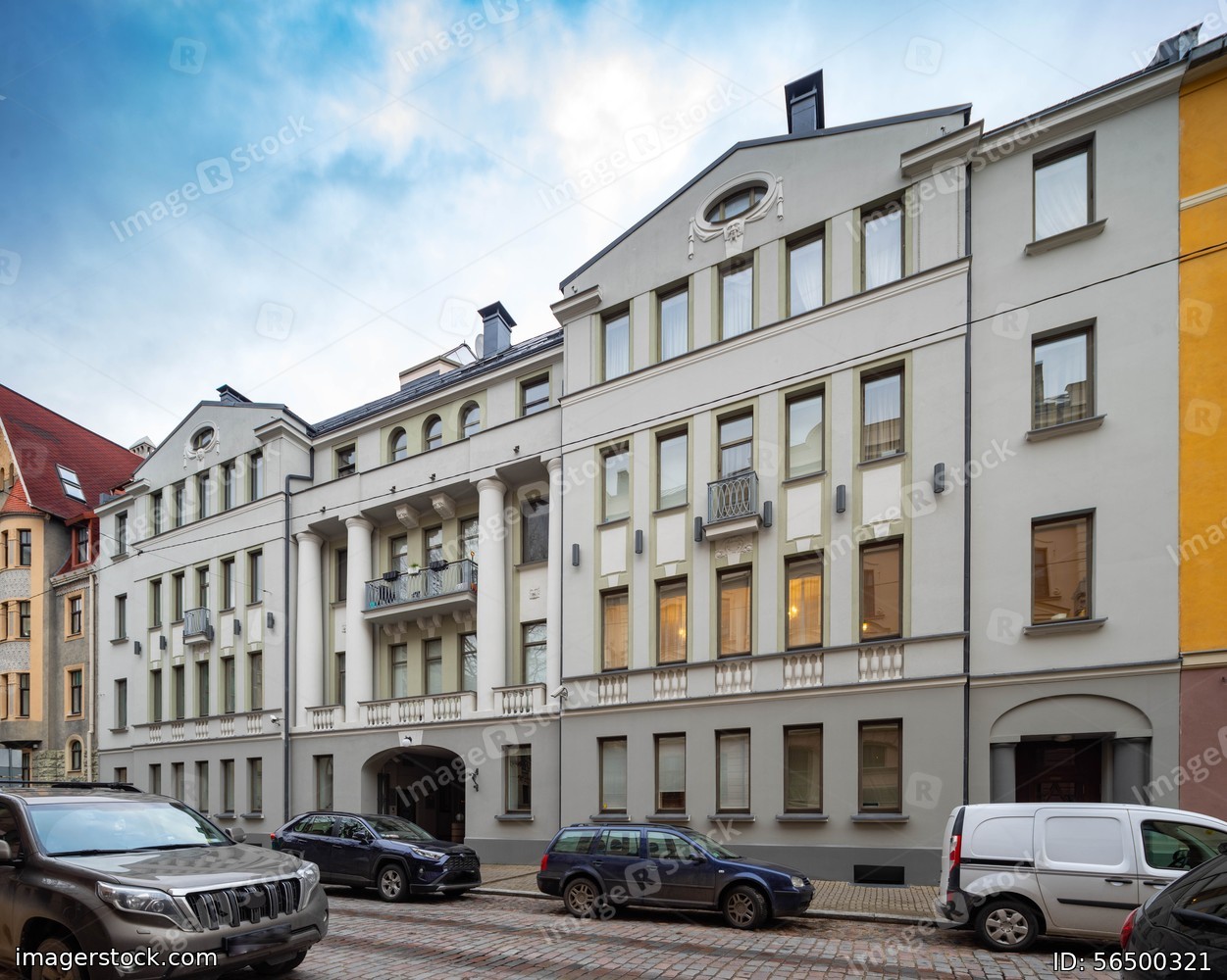 Modern buildings on the city street. Riga, Latvia. Car parking. Art Nouveau architecture.