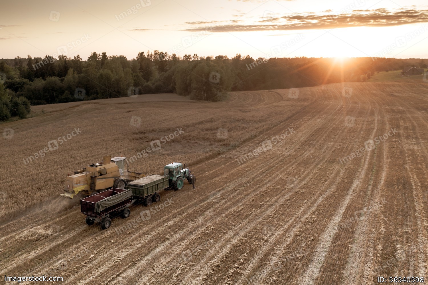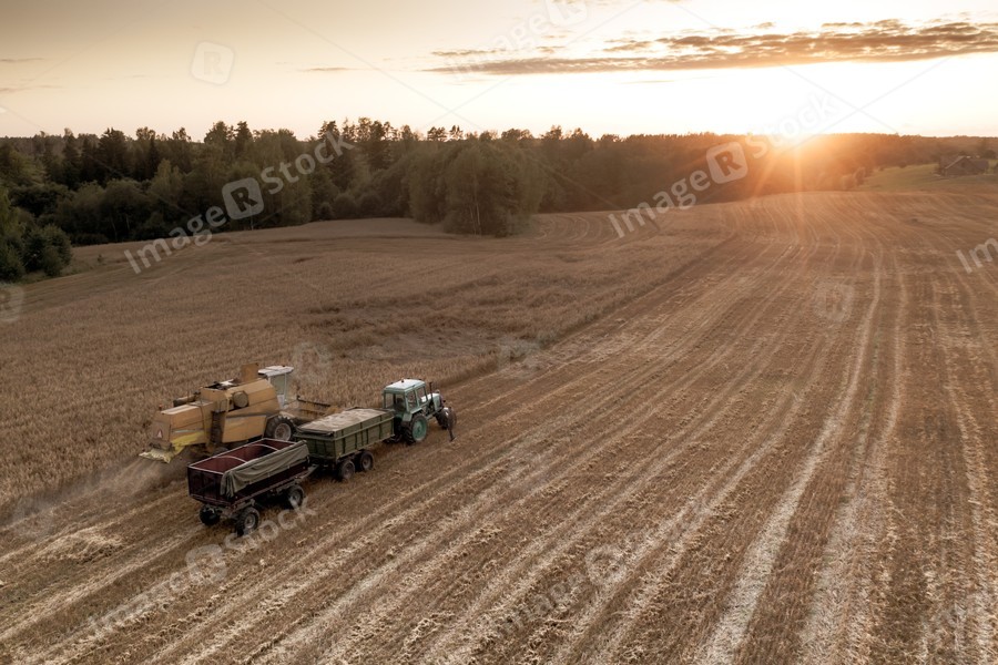 Top view of Combine harvester and the tractor on the field of ripe wheat in sunlight rays.