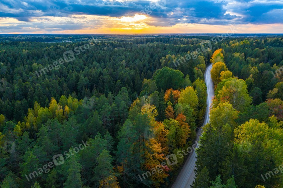 Latvian autumn nature. Forest and road. View from the top.