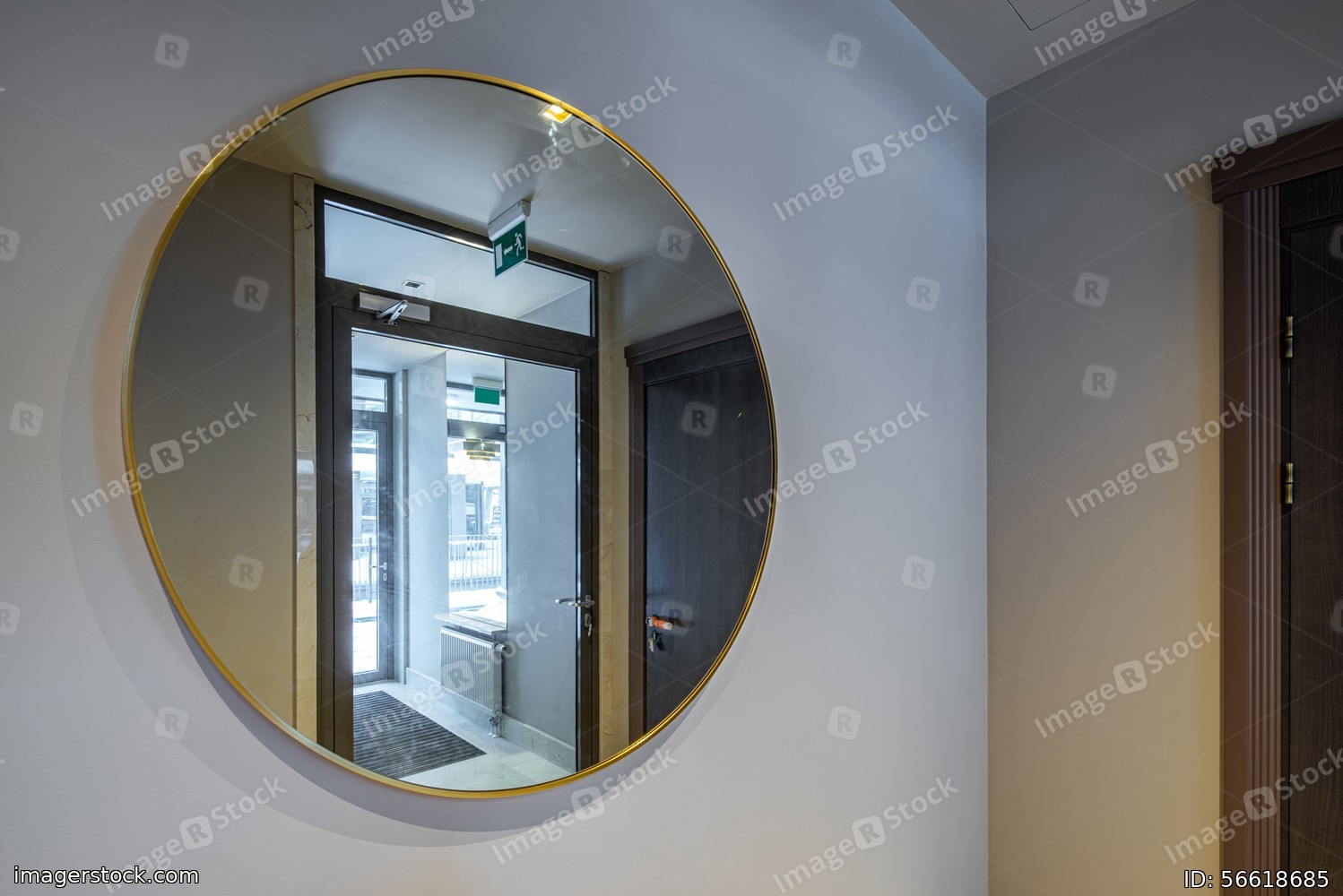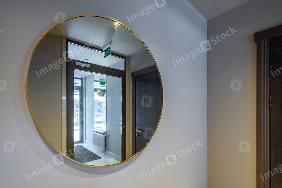 Modern interior of entrance. Mirror on grey wall. Residential building