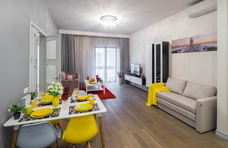 Contemporary interior of living room in modern apartment. Laptop and printer. Sliding door wardrobe. TV on wall. Wooden door.