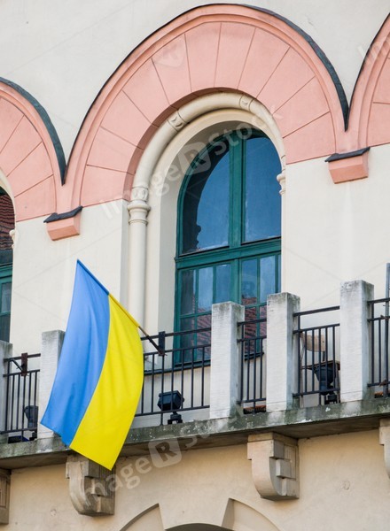 Facade of modern building in Krokow. Support of Ukraine. Flag on wall.