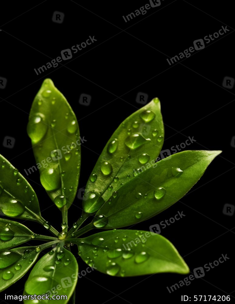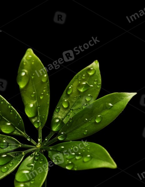 Rain drops on fresh green leaves. Isolated on black background