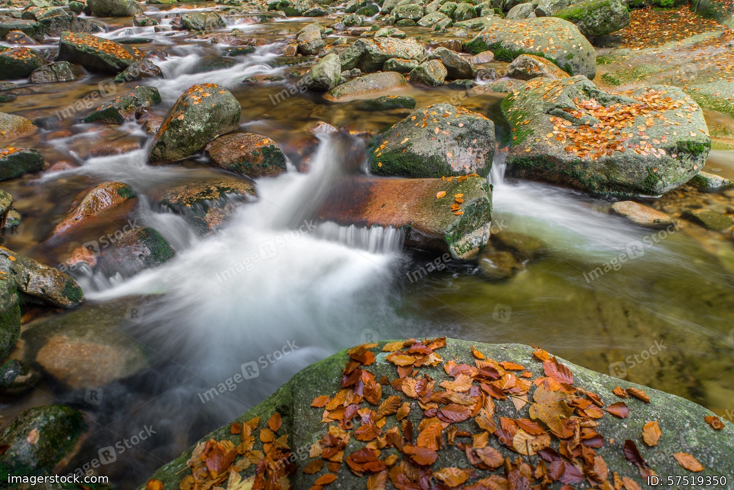 Autumn yellow forest and stone river stream.