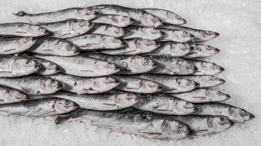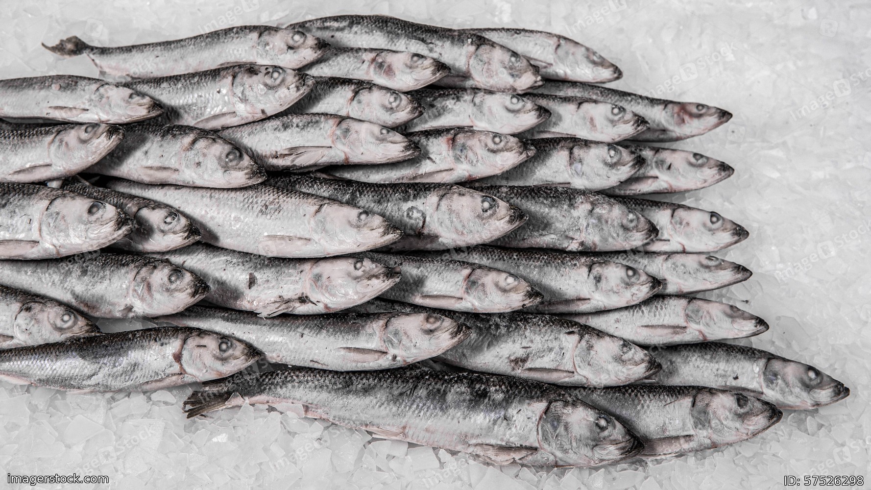 Close-up of fresh sprat on the ice in fish market. Winter fishing. Small silver fish production.