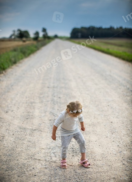 Little girl on the road in countryside. Summer.
