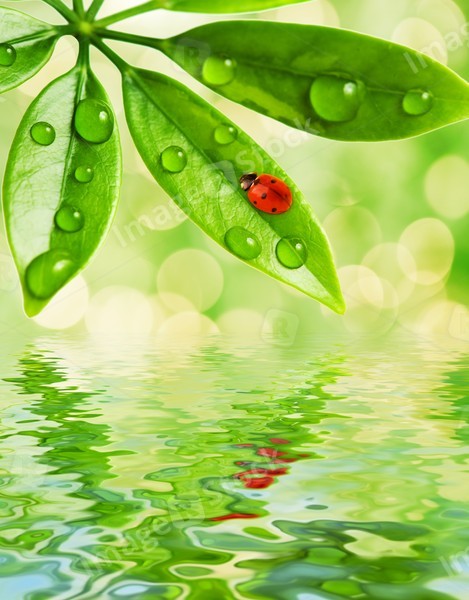 Ladybug sitting on a green leaf reflected in water