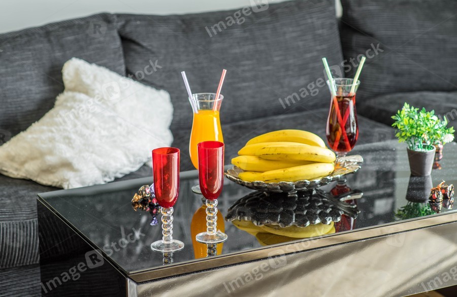 Bananas and orange on the plate. Couple of drinks. Red wine glasses. Close-up.
