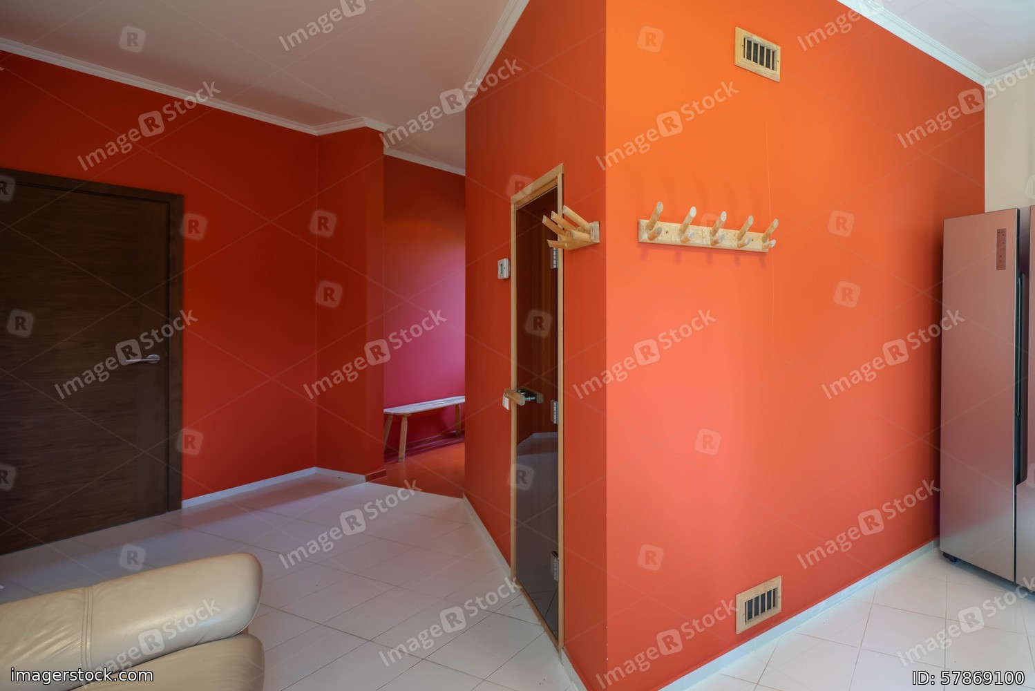 Contemporary interior of entrance hall in luxury apartment. Red wall. Modern refrigerator.