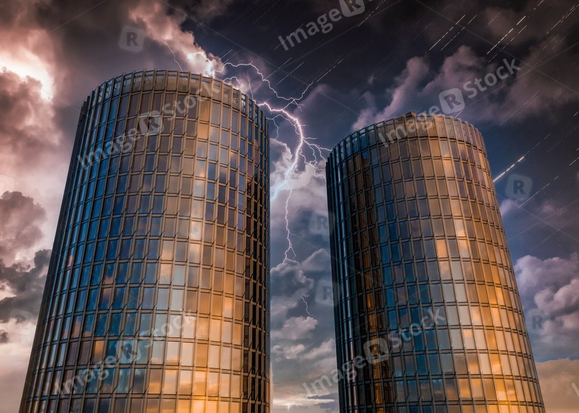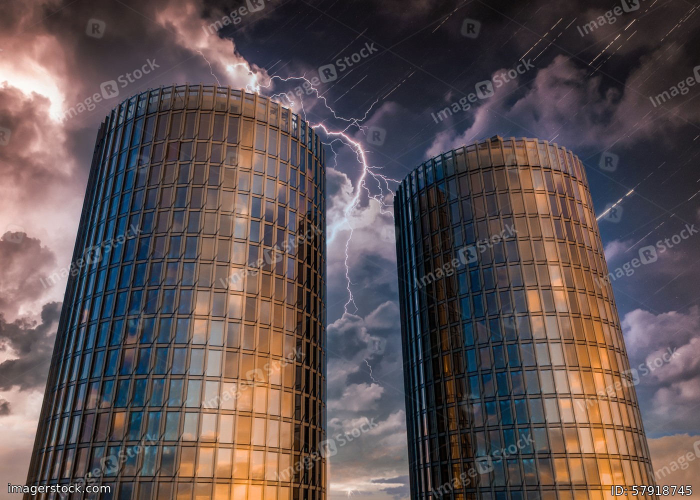 Urban architecture. Steel and glass facade of skyscrapers. Stormy sky.
