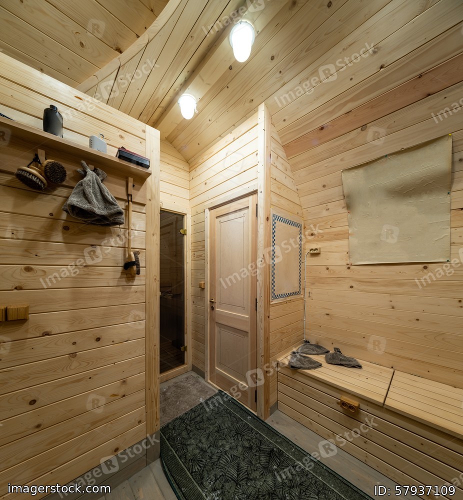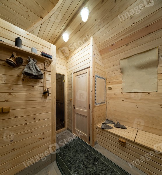 Wooden interior of modern bathhouse. Door to sauna.