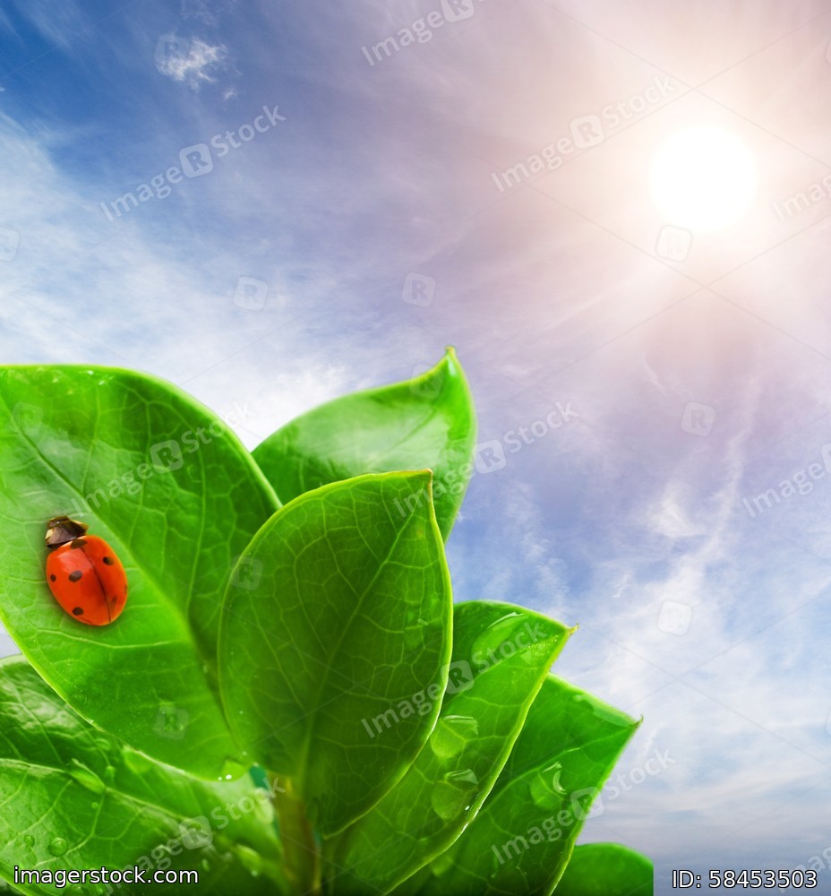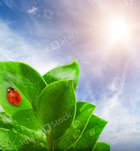 Ladybug sitting on a green leaf.