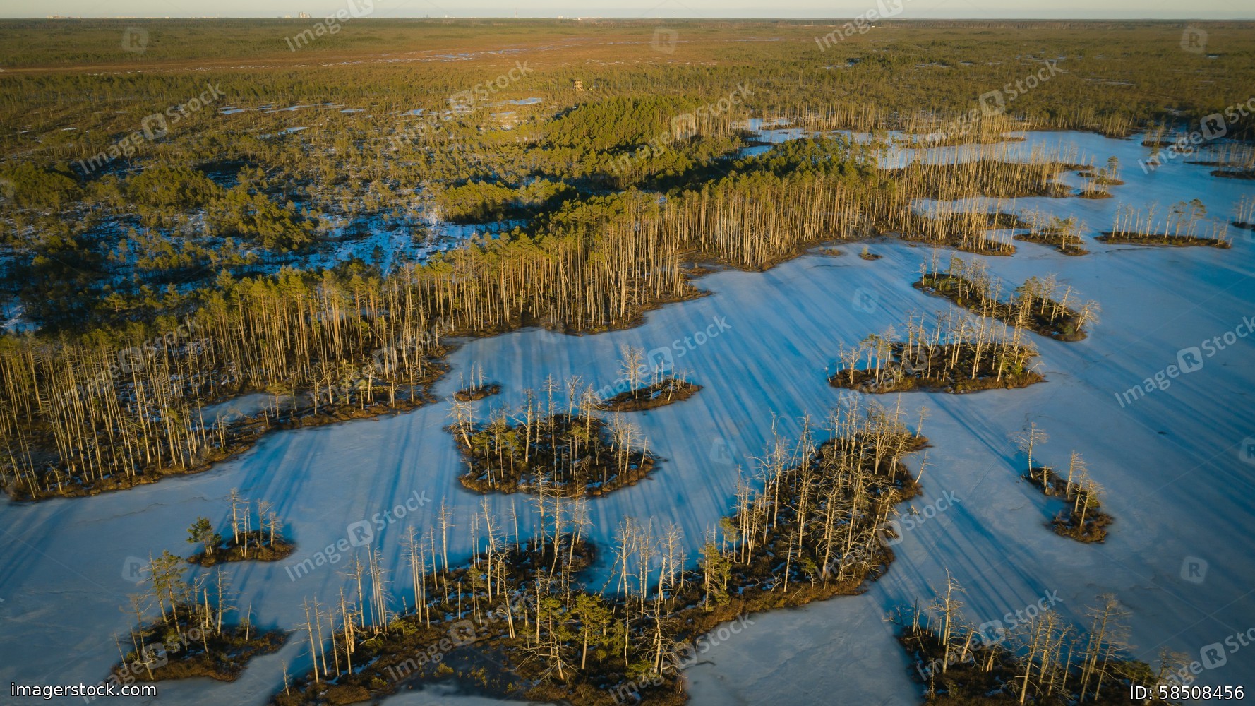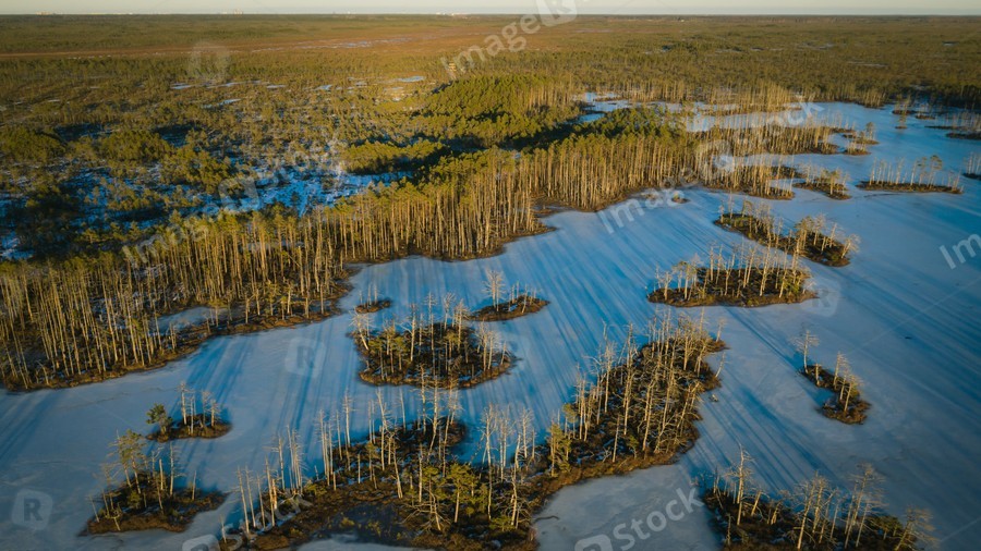 Scenic landscape of swamps at sunny day at early spring.