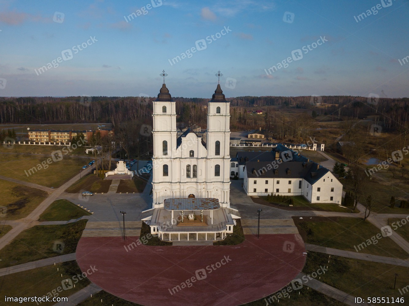 Top drone view of Aglona Roman Catholic Basilica of the Assumption of the Blessed Virgin Mary near road. Latvian landmark. Beautiful forest.