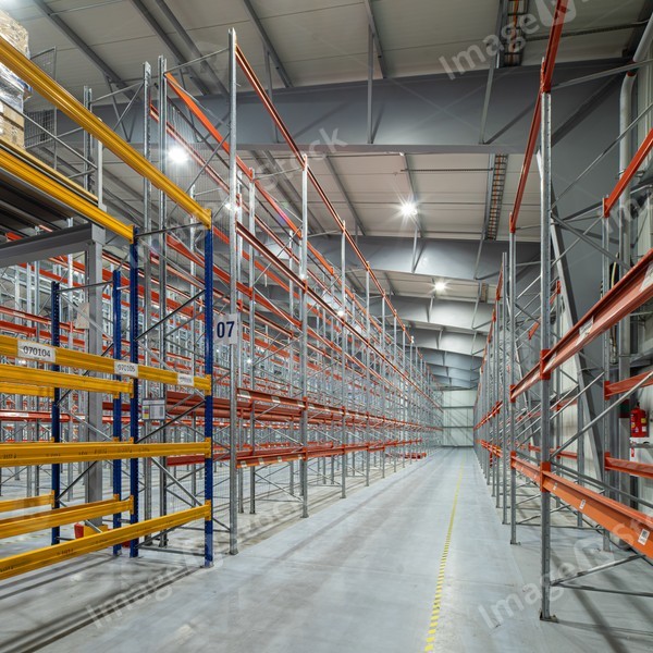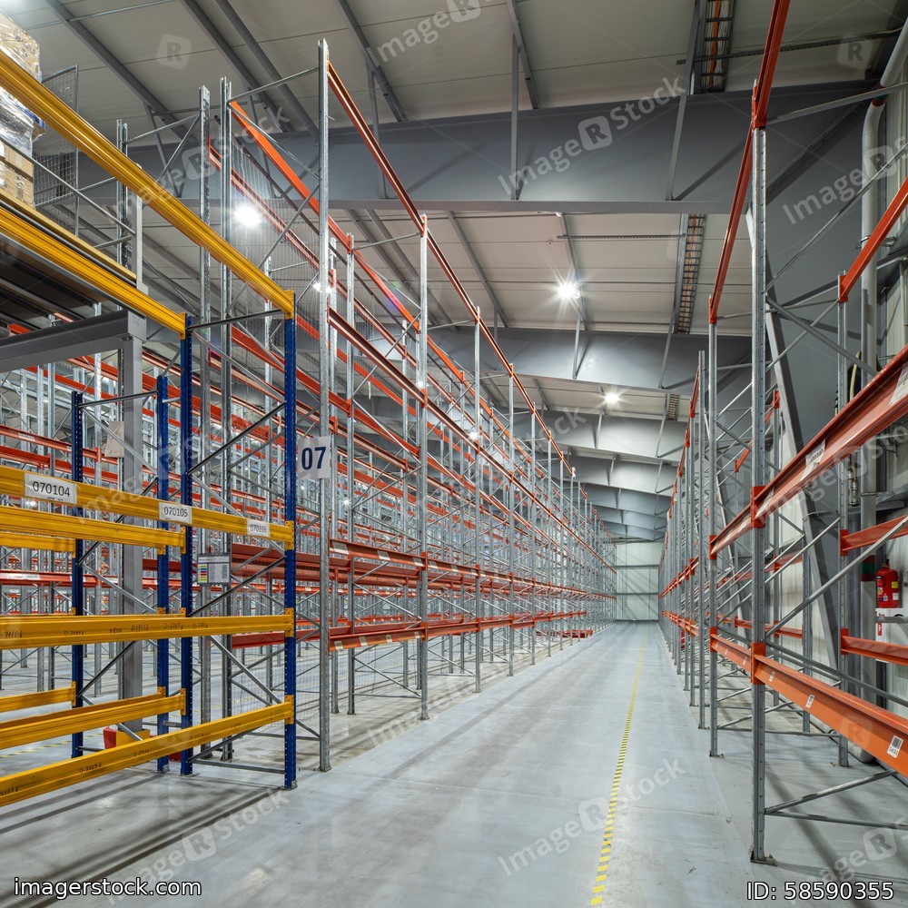 Interior of huge empty storehouse. Industrial warehouse racking.