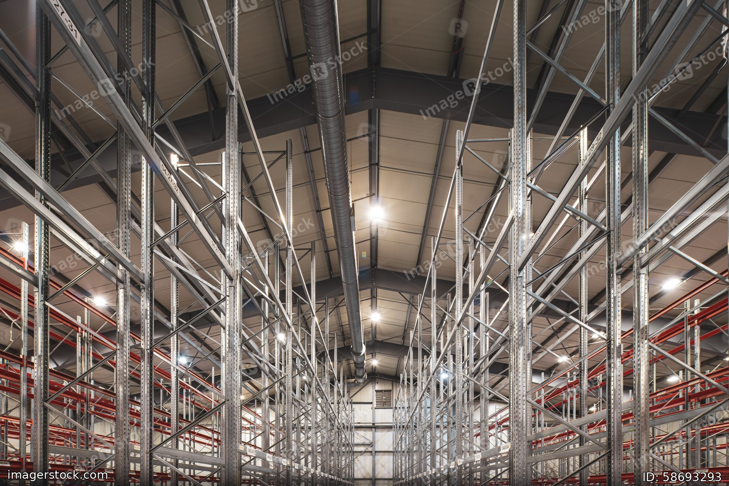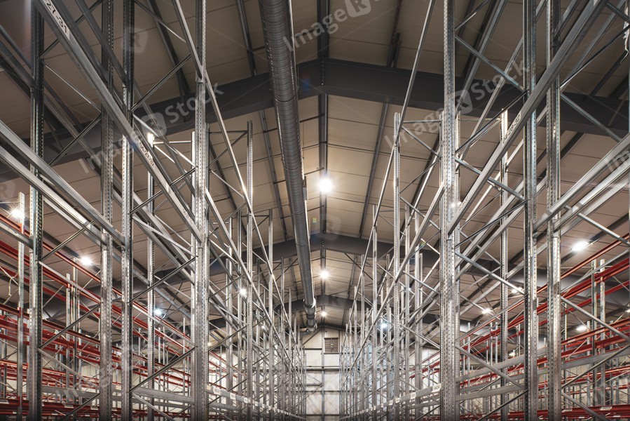 Interior of huge empty storehouse. Industrial warehouse racking.