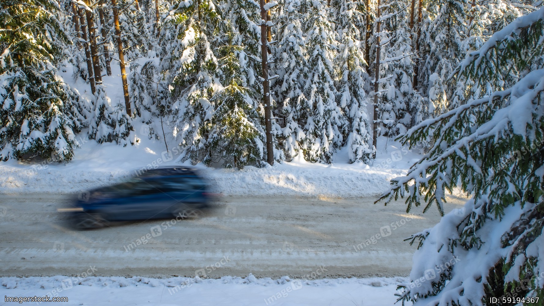 Scenic landscape of winter forest. Trees covered by snow. Car on road.