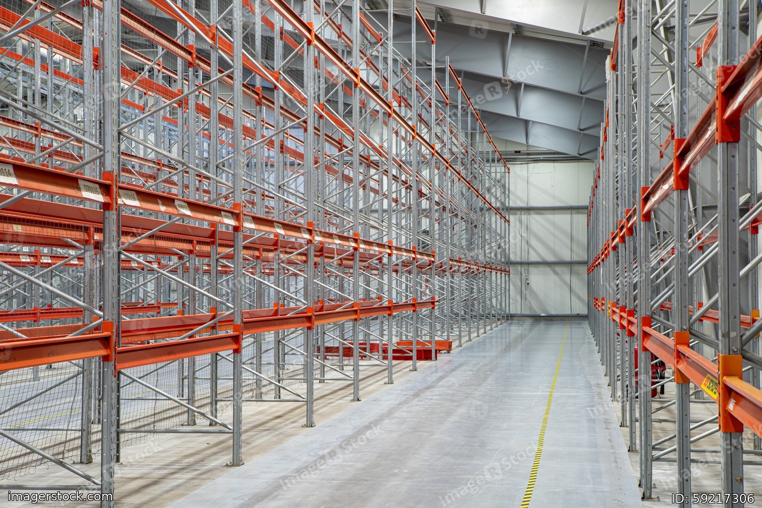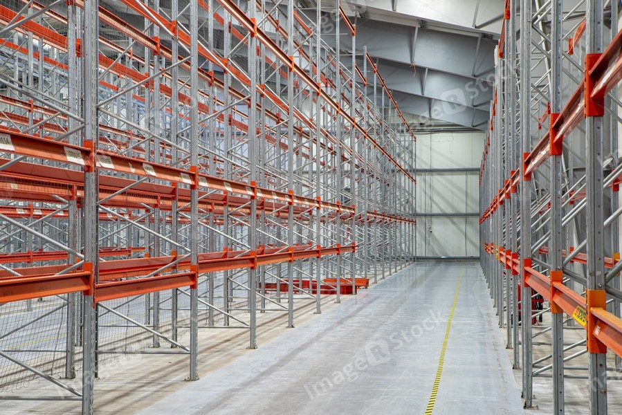 Interior of huge empty storehouse. Industrial warehouse racking.