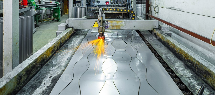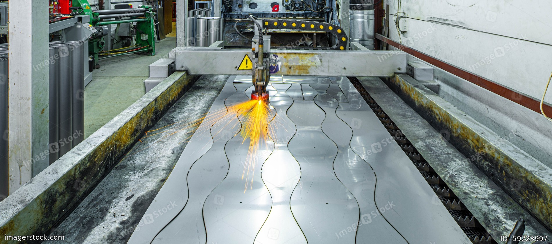 Plasma cutting of metal. Front view of working machine with sheet of metal. Metalworking.