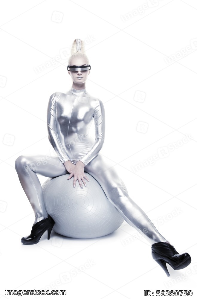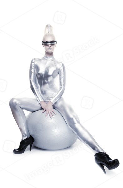 Beautiful cyber woman sitting on a silver ball