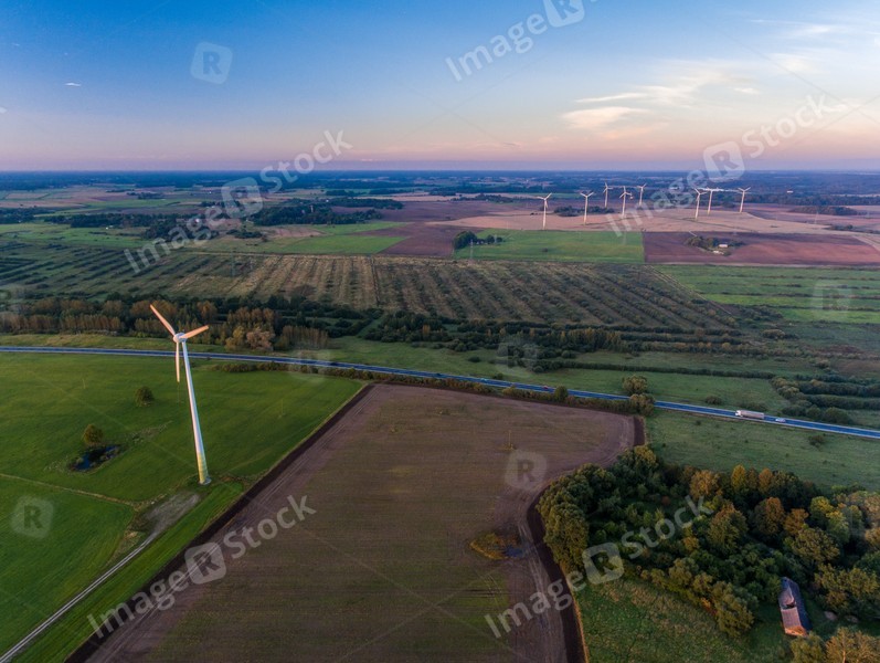 Wind generators, windmills. View from above. Sunset. Landscape.