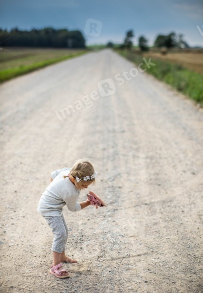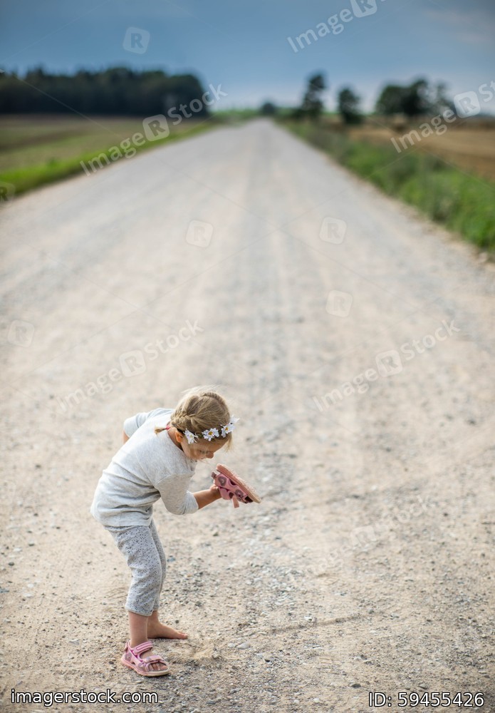 Little girl on the road in countryside. Summer.