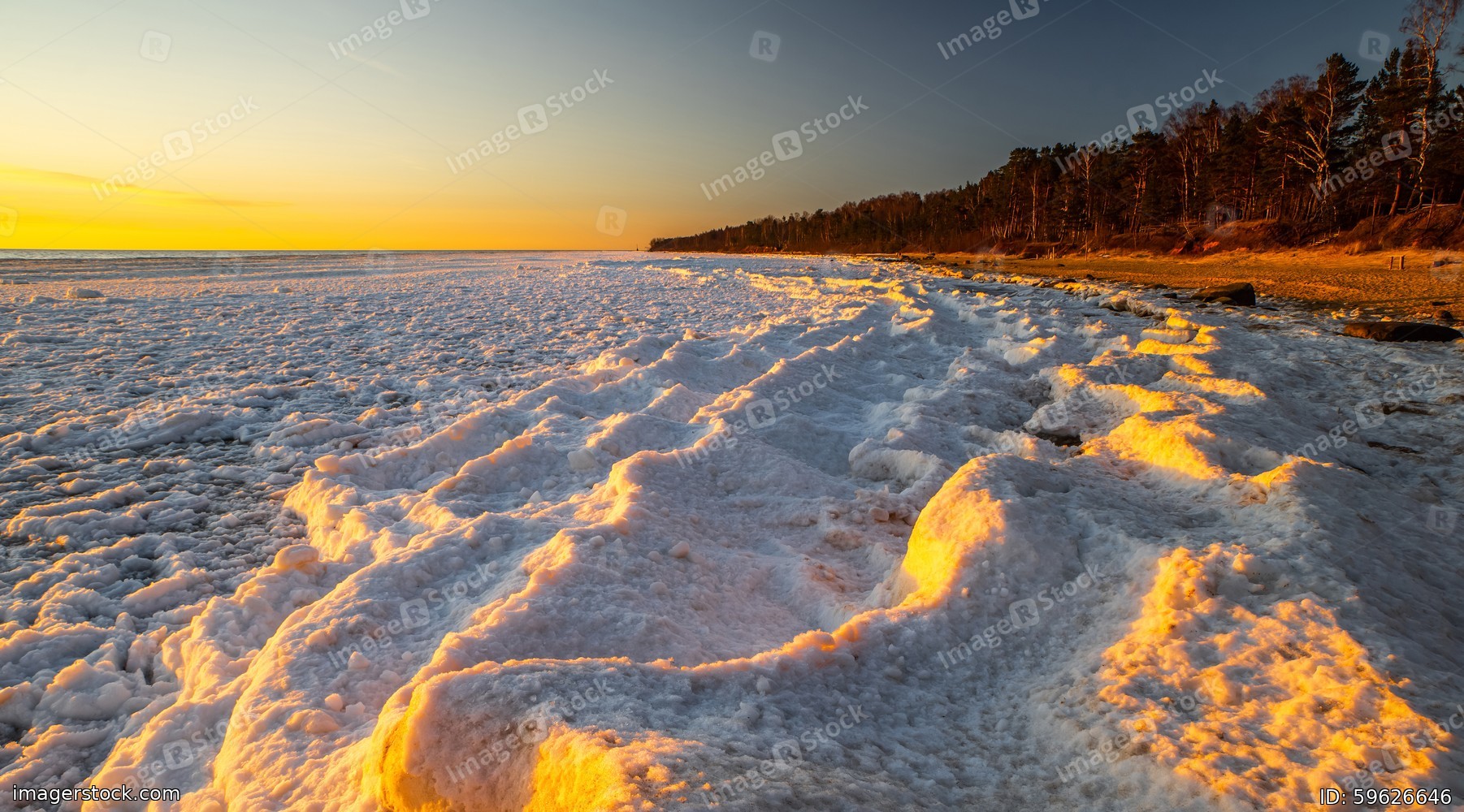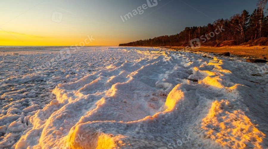 Snow and ice in sunset light on Baltic sea shore. Winter nature.