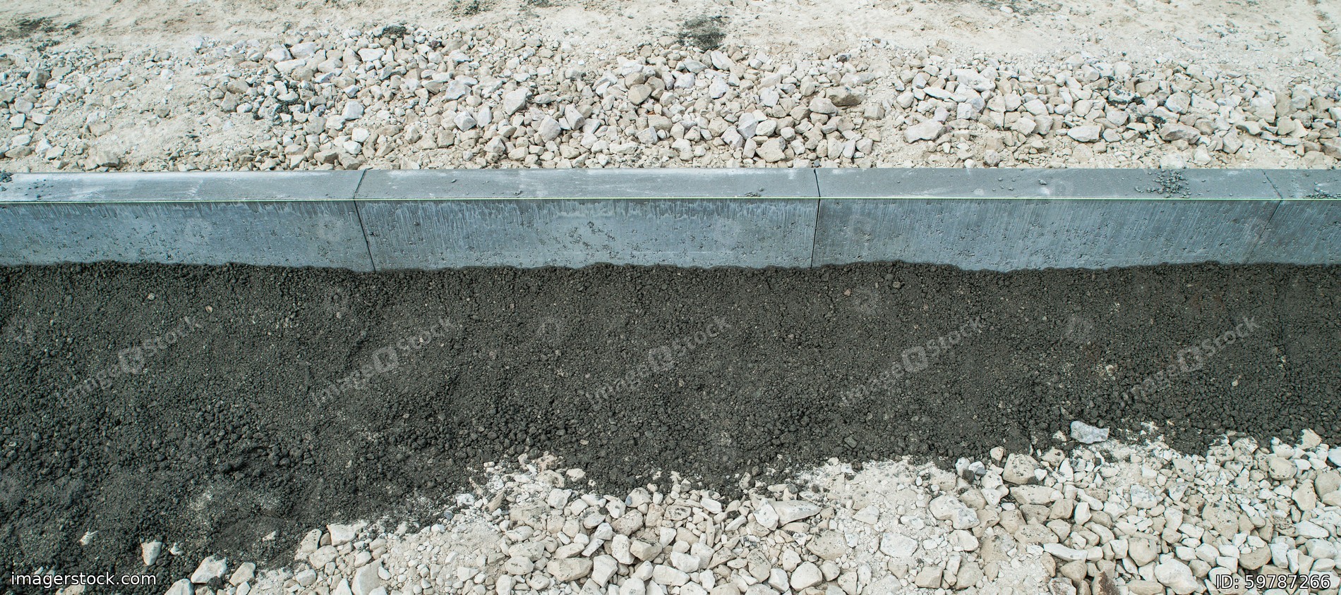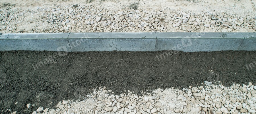 Construction of new sidewalk road. Close-up of concrete Ρurb and rubble.