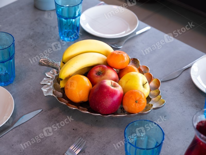 Close-up of fruits on table. Apples, oranges, bananas. Healthy food.